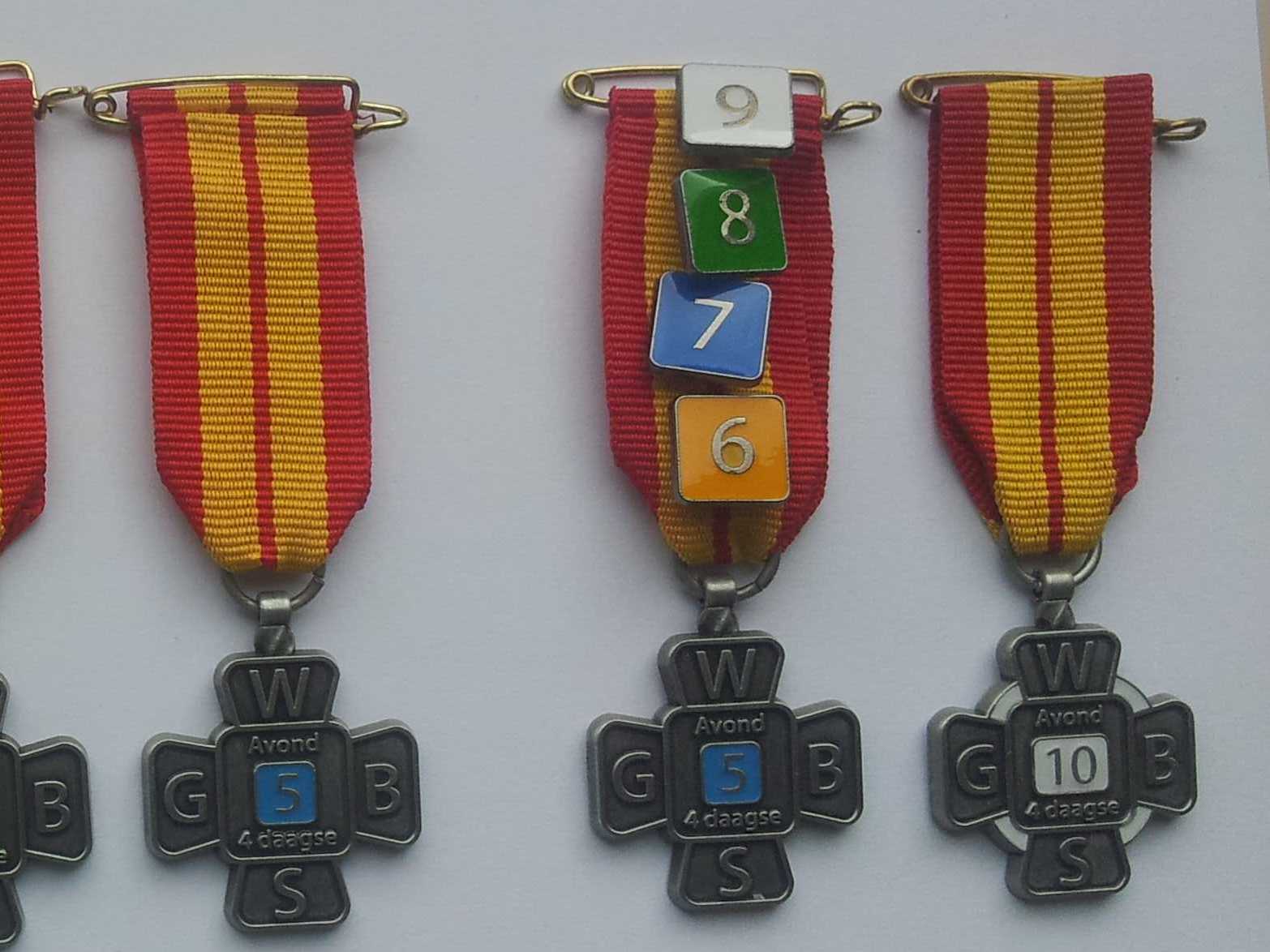 Hier ziet u de medailles die sinds de Avondvierdaagse van 2015 worden uitgereikt. De eerste 5 stuks zijn afzonderlijke medailles. Het 6-je, 7-tje, 8-je en 9-tje zijn speldjes die op de medaille 5 kunnen worden vastgezet. De 10 is weer een medaille.